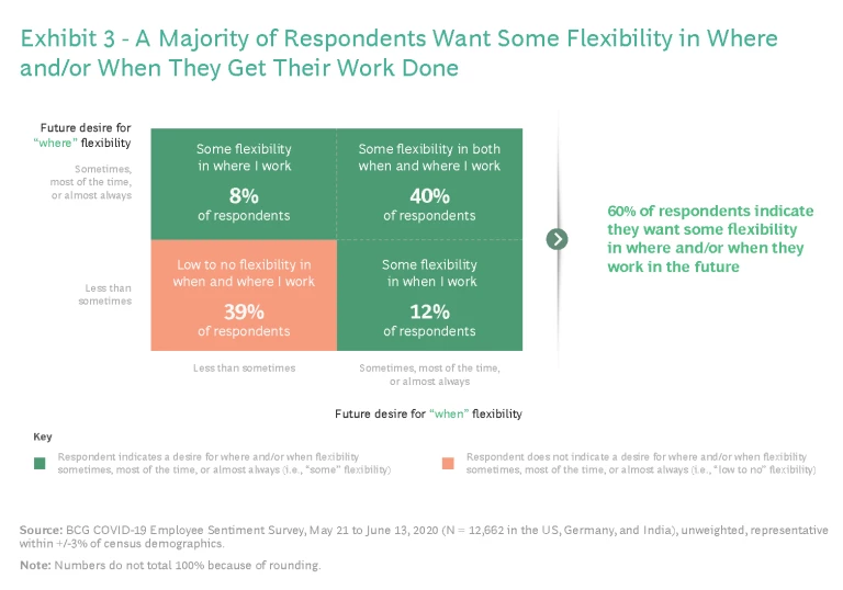 Shifts in the way we work are likely to continue as employers move a growing portion of their employees to more flexible models. In fact, BCG’s recent Workplace of the Future employer survey found that companies expect about 40% of their employees to follow a remote-working model in the future.