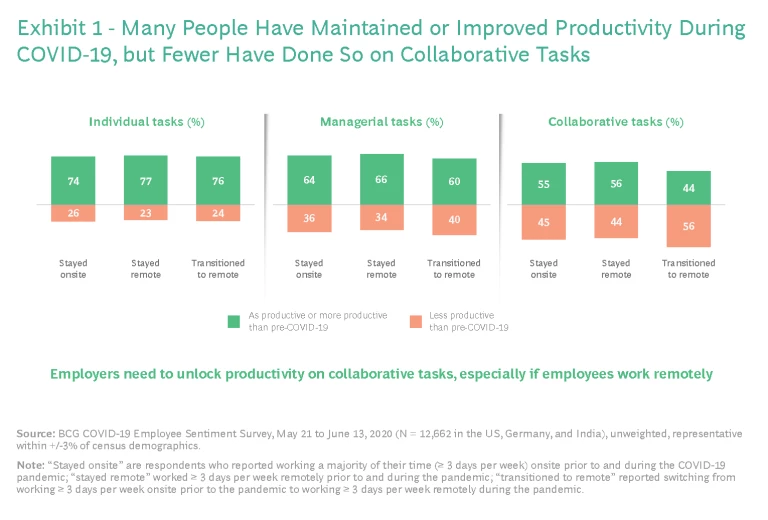 While this is a subjective productivity indicator, the data is still striking. Some 75% of employees said that during the first few months of the pandemic they have been able to maintain or improve productivity on their individual tasks (such as analyzing data, writing presentations, and executing administrative tasks). On collaborative tasks (including exchanges with coworkers, working in teams, and interacting with clients), the number is lower. But even so, more than half—51%—of all respondents said they have been able to maintain or improve their productivity on collaborative tasks. What’s more, this applies across geographic areas as well as to both remote employees and those who have remained mostly onsite—indicating that changes to the ways of working are having an impact across the board. (See Exhibit 1.)