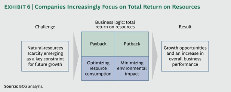 Constrained resources will increasingly force companies to take two governing metrics into consideration. They will have to monitor the payback from natural resources in order to minimize the consumption of scarce supplies. Electric utilities, for example, invest heavily in improving the efficiency of their generating plants to reduce how much fossil fuel they need in order to produce each megawatt. Companies will also have to watch their putback of natural resources in order to minimize their damage to the larger ecosystem. Electric utilities are investing in scrubbers and other processes to reduce the harmful emissions they release into the atmosphere. (See Exhibit 6.)