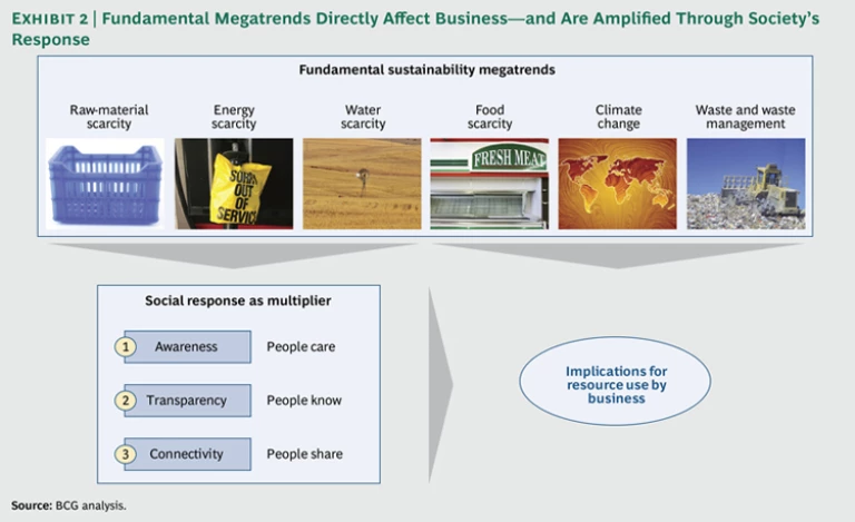 Six sustainability megatrends are particularly pertinent for businesses and are amplified by society’s response. (See Exhibit 2.) Taken together, they represent a real call to arms for all companies in terms of addressing resource management. The decline of readily available supplies will increase competition and price volatility for four key factors of production: raw materials, energy, water, and food. At the same time, companies will need to become more aware of their generation of emissions and waste—especially if they pose health or pollution risks.
