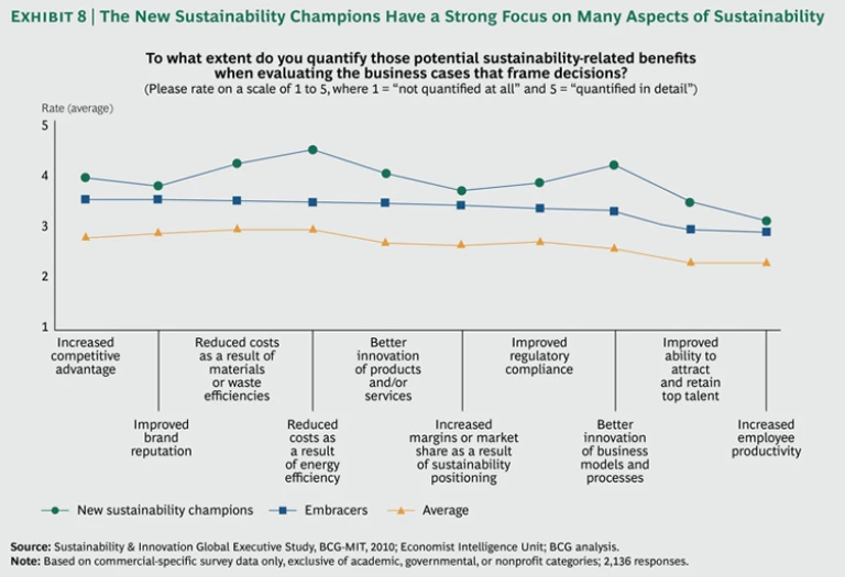 Indeed, they are outliers when compared with the “embracers” of sustainability, as identified by the BCG-MIT Sloan Management Review collaboration of 2011. Embracers are companies that say sustainability is necessary for profitability, have it permanently on their management agenda, and have made a business case for sustainability. Compared with them, the champions have a more holistic outlook, including a wide variety of environmental and social elements in their thinking. They push multiple boundaries at the same time but with one clear focus and business logic. They are better at measuring the benefits of their efforts—not just in terms of quantifiable targets, such as energy efficiency, but also in terms of intangibles such as corporate reputation and attractiveness to talent. (See Exhibit 8.) They also seem to incorporate the risks of resource shortages more deliberately into their business decisions than the embracers do.