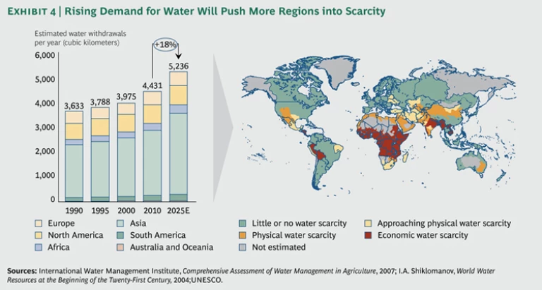 Water is often taken for granted, but freshwater supplies are also tightening in many parts of the world. There are multiple reasons for this, but rising affluence is a key driver. Many new middle-class consumers, for example, are replacing grain in their diet with meat, which requires far more water to produce. (See Exhibit 4.)