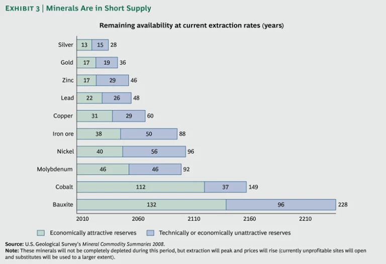 Many commonly used materials have relatively limited known reserves. For example, silver, gold, zinc, and lead may no longer be available 30 years from now—except through recycling—if significant new stocks are not discovered or made economically viable. (See Exhibit 3.)