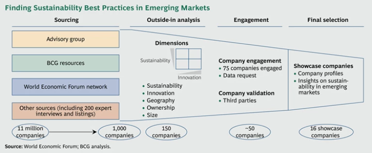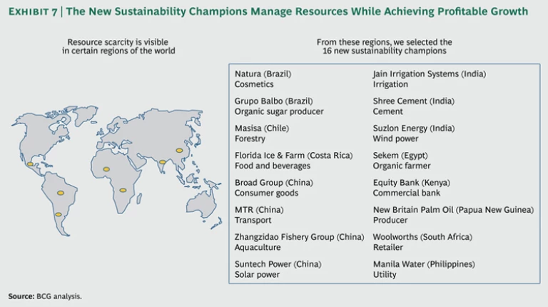 For the past two years, the World Economic Forum and The Boston Consulting Group have worked together to find sustainability leaders in the developing world. After researching thousands of companies, we focused on 16 that have managed resources wisely while achieving profitable growth. (See Exhibit 7. For more on this project and the methodology used, see the Appendix.)