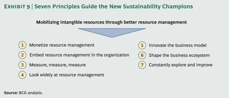 What are the key elements of an internally driven focus on sustainability and growth? Through a series of interviews and deep-dive analyses, we have distilled seven core principles that guide the new sustainability champions’ focus on total return on resources. (See Exhibit 9.) These principles may seem familiar management dictates for any major initiative, yet they take on special significance in the context of resource management.