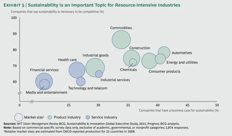 To understand what that means, we can turn to companies that already face resource constraints. In BCG’s annual survey of executives across the globe, cosponsored with the MIT Sloan Management Review, we saw that resource-intensive industries treat sustainability as a core issue. They view resource management as a necessary part of their competitiveness, and many of these companies have a business case to support and drive their actions. (See Exhibit 5.) Each year, they put more emphasis on sustainability issues as resource challenges become more pressing.