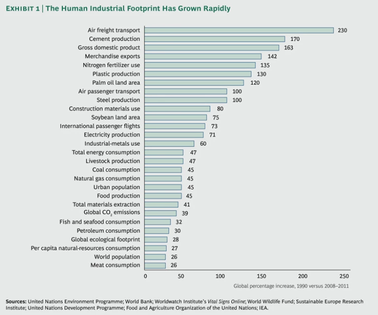 Companies are facing a new world of resource constraints. Humanity’s industrial footprint has greatly increased over the past two decades. (See Exhibit 1.) With rapid economic development in much of the world, global GDP is expected to rise from $69 trillion in 2008 (by purchasing power parity) to $135 trillion by 2030. The population will continue to grow, from 6.7 billion to 8.2 billion, in that same period. As a result, it will become increasingly challenging to meet demand for several vital minerals and metals, as well as for oil and water.