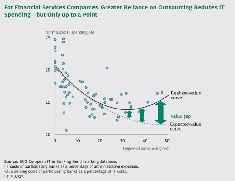BCG’s experience confirms this finding. Indeed, we have found a particularly striking relationship between IT costs as a percentage of administrative expenses and a company’s reliance on outsourcing (measured by outsourcing’s share of total IT spending). Our research indicates that, for many companies, rising IT cost savings correlate with increasing deployment of outsourcing only to a degree. For example, a recent BCG benchmarking study revealed that IT costs as a percentage of administrative expenses at financial services companies do indeed fall as outsourcing increases. But after a certain point, IT costs as a percentage of administrative expenses actually begin to increase. (See the exhibit.) Moreover, we have observed a similar relationship between outsourcing and IT costs for companies in other industries, and the pattern holds over time. This suggests that a company’s ultimate return on outsourcing will be capped unless it can identify and remedy the underlying problems.