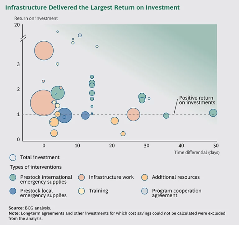 To gain greater clarity about the benefits of emergency preparedness, Unicef and the World Food Programme (WFP) engaged The Boston Consulting Group to analyze investments made in the countries of Chad, Pakistan, and Madagascar. The goal was to quantify the time and cost savings of specific preparedness interventions and to determine which ones delivered the greatest return on investment (ROI). Several types of interventions were analyzed: prestocking emergency supplies, infrastructure improvements, training to enhance staff capabilities, and negotiating long-term agreements with suppliers. Of the 49 emergency-preparedness interventions that were studied, 64 percent are expected to save both time and money in an emergency, and 93 percent would shorten response times by more than one week, on average. Because of its direct link to the number of lives saved, speed is especially critical in an emergency.