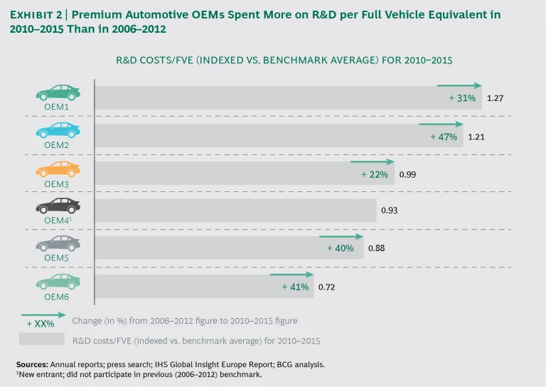 What does this new measure of R&D tell us about the auto industry’s efficiency? The news is not good. We calculated the R&D-to-FVE ratio for six premium automakers in two periods, 2006 through 2012 and 2010 through 2015. (See Exhibit 2.) The numbers reveal a steep drop in efficiency: the ratio during the period from 2010 through 2015 ranged from $716 to $1,266 million per FVE, up from $509 to $966 million during the period from 2006 through 2012.