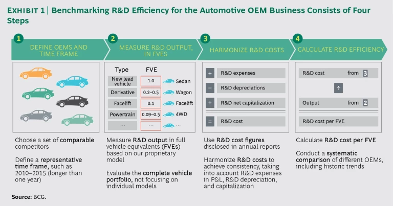 To address the need to zero in on true R&D efficiency, BCG has developed and applied a metric: the ratio of R&D spending in a certain period to what we call “full vehicle equivalents” (FVEs) developed during that period. This approach enables us to measure what was spent—and what new products that spending actually yielded.