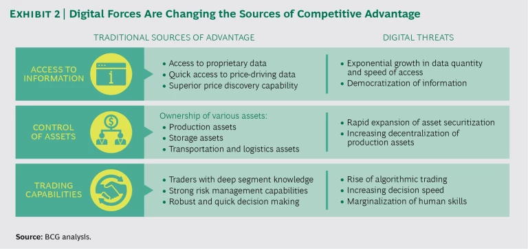 As digitalization makes markets more efficient, these companies will benefit from fairer price formation and increased transparency. Many industrial commodity players that have built value chain optimization and trading arms, however, will come under increasing pressure from digital technologies. The challenge is likely to play out across a number of dimensions: