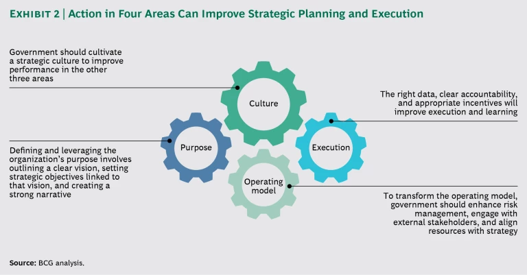 The key to upping government’s game on this front is to understand what prevents effective strategic planning and execution and then to attack those challenges head on. On the basis of its more than 50 years of working as a leader in strategy, BCG has developed deep insight into the barriers that confront the private sector and an understanding of how they also challenge the public sector. These hurdles include a planning system that is too focused on bureaucratic processes at the expense of outcomes. In the public sector, such challenges are compounded by the frequent changes in leadership that are tied to election cycles, entrenched hierarchies and regulations, and a culture of risk avoidance.