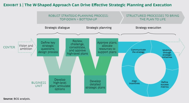 Exhibit 1 illustrates one highly effective approach to strategic planning: the W-shaped model. (See Four Best Practices for Strategic Planning, BCG Focus, April 2016.) This approach starts with leadership’s definition of the organization’s vision and strategic ambition. Next, the division, field unit, or function heads are asked to respond to a series of pointed questions about the organization’s big challenges relative to this vision. Answering these questions, the unit or function heads suggest concepts or proposals for meeting the challenges. On the basis of their subsequent discussion, management selects proposals and assigns the unit or function heads responsibility for developing detailed plans for putting those proposals into action. Management drives execution of the plan, as well as a system for learning and adapting that is based on new information.