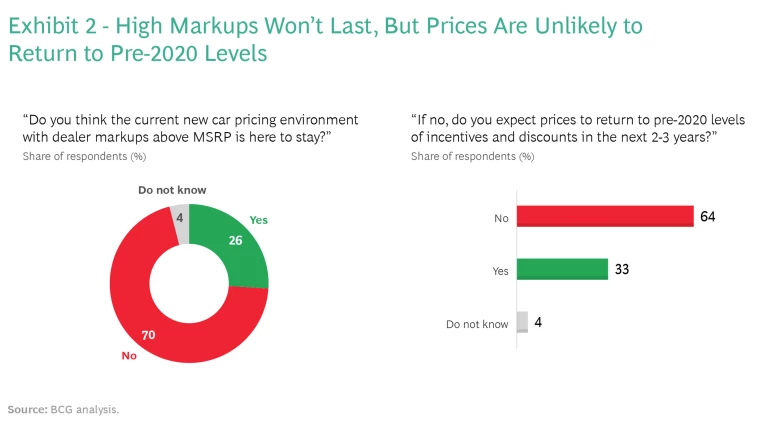Seventy percent of dealers also believe that the current pricing environment, in which dealers have been able to mark up prices above the manufacturer’s suggested retail price, won’t last. That’s partly due to recession fears as well as the fact that OEMs have been demanding that dealers stop such practices—and are increasing prices themselves to offset rising costs and boost profits. Still, nearly two-thirds of dealers don’t expect prices to return to pre-2020 levels, when sizable incentives and discounts were common, for at least two or three years. (See Exhibit 2.)