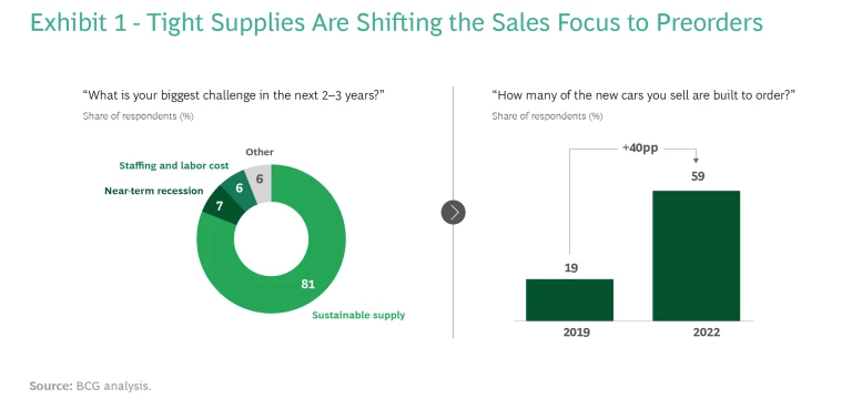 Looking ahead, 81% of dealers see inventory shortages as their most serious challenge for the next two to three years. The expectation that OEMs won’t be able to manufacture enough light vehicles to meet strong US demand is supported by BCG research. In 2021, we estimated that around 10 million vehicles globally were not produced and sold because of the semiconductor shortage. This has reset expectations in the auto industry. We project at least 9 million such lost sales in 2022 and that supply and demand won’t return to balance until 2024.