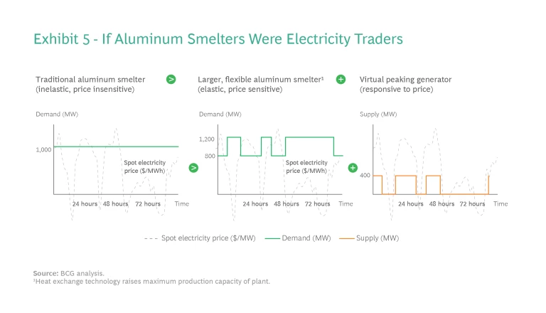 Like a peaking generator, the smelter can change production levels quickly and sell electricity back to the market. It bases the decision to alter production on the electricity price and its “fuel cost.” In the case of a real peaking generator, the fuel cost is the price of gas; in the case of our smelter’s virtual generator, the “fuel cost” is foregone margin from aluminum production. As a result, the flexible energy user (the aluminum producer) can think about the electricity market in a similar way to electricity generators—as a source of value rather than a cost. The approach also tends to support the broader electricity system: by selling electricity back to the system at times of peak demand, or during congestion, companies can help reduce the impact of these events.