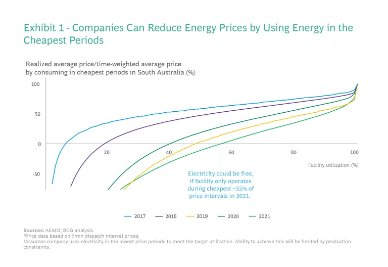 In increasingly volatile electricity markets, companies will no longer have the option of contracts that are both low cost and fixed price. Consequently, the value of using energy flexibly is becoming far higher. Companies that can be flexible about when they use electricity—by using less when it is expensive and more when it is cheap, free, or even negatively priced—will be able to significantly lower their energy costs. South Australia is at the frontier of this trend and provides an example of the benefits of flexibility in the face of rising price volatility. (See Exhibit 1.)