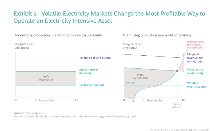 Such market volatility changes how companies should operate electricity-intensive assets in order to maximize profitability. When companies treat electricity costs as a constant, they maximize profitability by achieving full utilization. By comparison, companies that operate in volatile electricity markets and use energy flexibly maximize their profit margins by operating plant at the optimal utilization rather than the maximum utilization. (See Exhibit 2.)