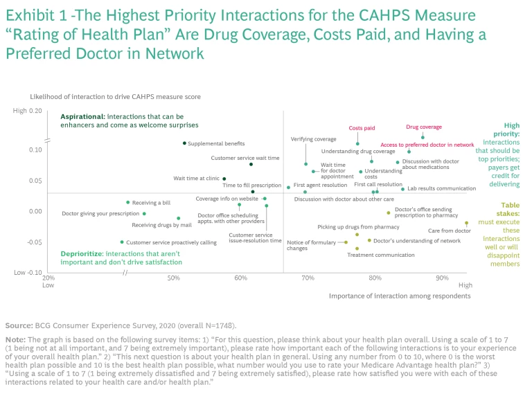 More than 70% of survey respondents assigned each of these interactions the highest levels of importance, and each drives satisfaction with four or more CAHPS measures. Collectively, they provide a clear roadmap for plans to assess their CAHPS performance, reinforce areas of strength, and shore up areas of underperformance. For example, the analysis reveals that when it comes to the CAHPS measure “Rating of Health Plan” drug coverage, costs paid, and having a preferred doctor within the insurance network are the top priorities. (See Exhibit 1.)
