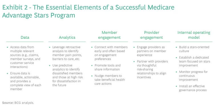 Based on the research and the changes that CMS is implementing, we have identified five essential elements that payers must get right to position themselves to achieve strong star scores. (See Exhibit 2.)