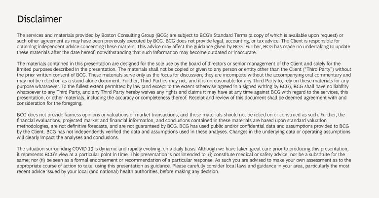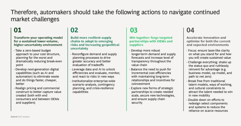 Transform your operating model for a lower-volume, higher-uncertainty environment. Take a zero-based budget approach to your cost structure, planning for the worst and dramatically reducing the break-even point. Develop next-generation digital capabilities (such as AI and automation) to eliminate waste and to do things faster, cheaper, and more effectively. Realign pricing and commercial structures to better capture value created with end consumers and between OEMs and suppliers.