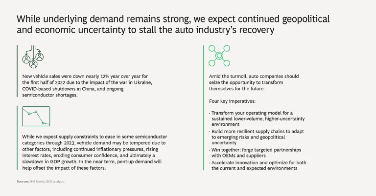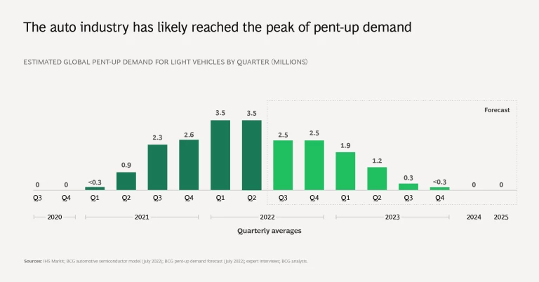 This slowdown in demand, combined with continued geopolitical tensions, ongoing labor shortages, and a lack of semiconductor availability for certain automotive applications, means the industry is in for a period of continued difficulty. The bottom line? It is unlikely that the auto market will revert to prepandemic volumes before 2025 .