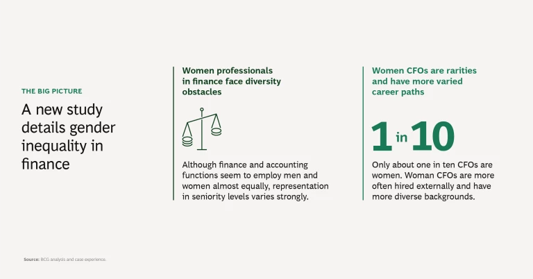 The scarcity of women finance leaders hurts companies. Previous studies by BCG and other organizations show that a more balanced share of women, especially in senior positions, boosts innovation, resilience, and financial performance, among other benefits. Additionally, we have found that women in finance functions are more likely than men to have multidisciplinary backgrounds, potentially enhancing their abilities to lead enterprise-wide transformations.