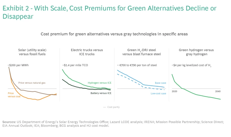 The tragedy of this phenomenon is that the discouraging financial barriers are temporary: technology costs fall as usage scales up. As producers deploy the technology more broadly, they learn how to drive efficiencies in laying out facilities and in operating and maintaining equipment. Ultimately, robust supply chains form to meet the needs of the new processes. Solar electricity generation rode this learning curve to become less expensive than fossil fuel generation in just 20 years, and similar dynamics are likely playing out with other key green technologies. (See Exhibit 2.)