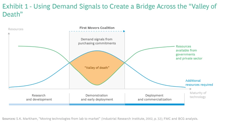In light of these challenges, the World Economic Forum, the Office of the US Special Presidential Envoy for Climate, and Boston Consulting Group (acting as the knowledge partner) created the First Movers Coalition (FMC). Its goal is to accelerate the deployment of critical decarbonization technologies in hard-to-abate sectors. The FMC was launched at the November 2021 UN Climate Change Conference (COP 26) in Glasgow.