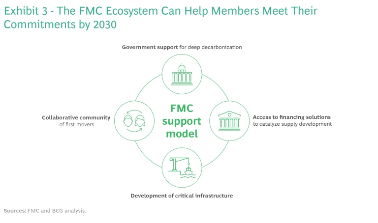 Demonstrating that demand exists for decarbonized products, even at a cost premium, is critical to catalyzing investments in green production. However, a demand signal alone may not be enough. The FMC recognizes that additional action may be necessary to create a favorable environment for suppliers to invest in decarbonization. The organization has identified four key areas of support to stimulate supply creation and help FMC members secure offtake for those products: government support for deep decarbonization, access to financing solutions to catalyze supply development, development of critical infrastructure, and a collaborative community of first movers. (See Exhibit 3.)